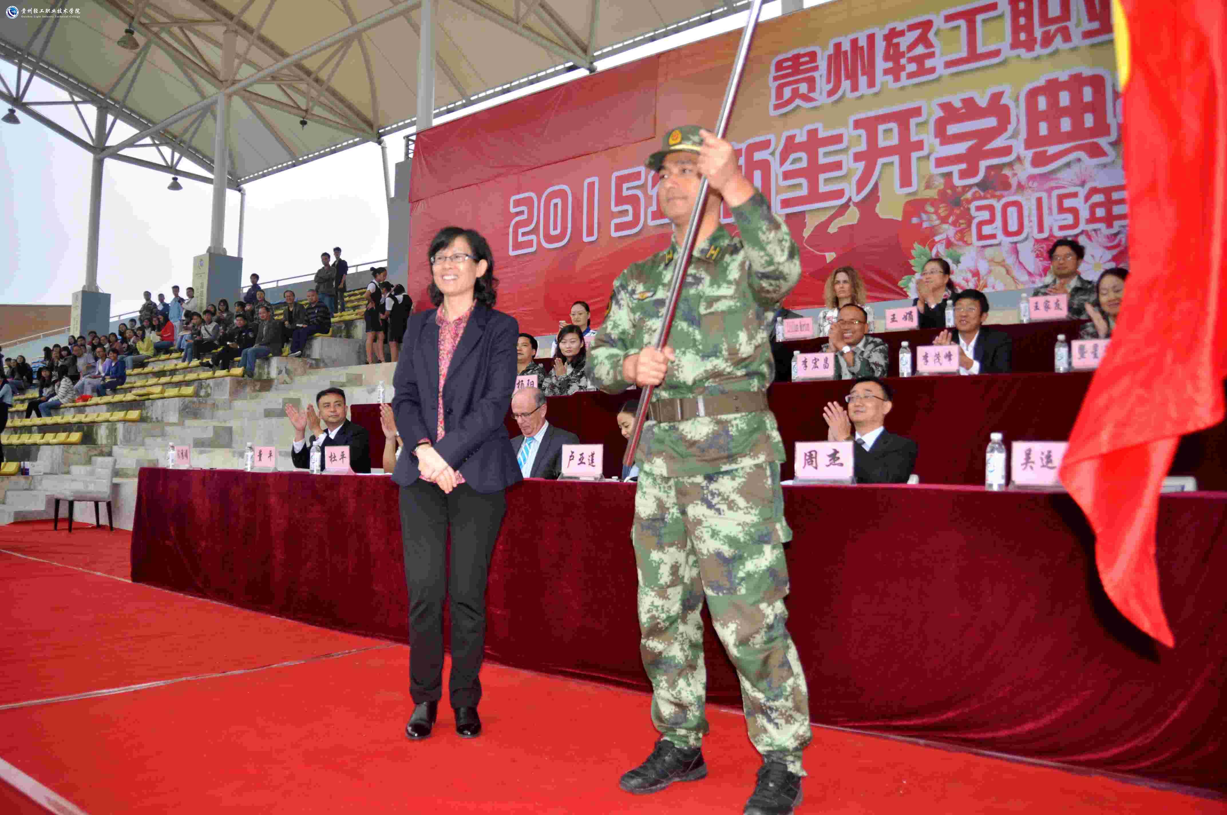院长周杰宣布了《2015级新生军训团组织机构名单》。党委书记卢亚莲向军训团授旗,军训团团长吴运发接旗。